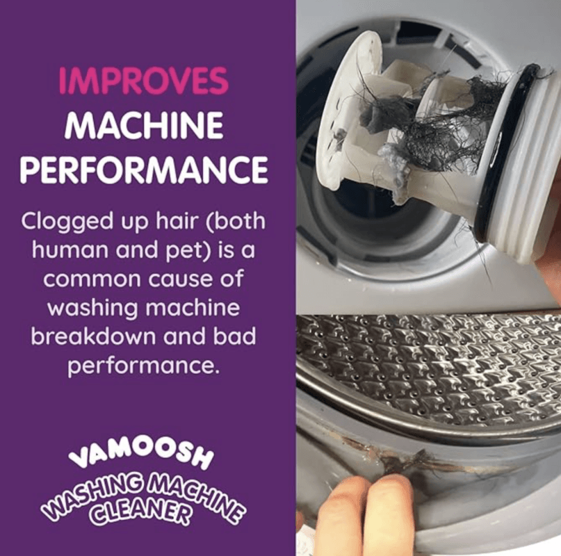Clogged up hair is a common cause of washing machine breakdown and bad performance (which can then lead to bad odours.) Vamoosh Washing Machine Cleaner's unique formula contains patented hair dissolving technology that removes clogged up hair whilst also eliminating dirt, limescale, 99.9% bacteria and bad odours. VAMOOSH Washing Machine Cleaner is all you need to protect your washing machine, prevent blockages and maintain freshness.UNIQUE 6-in-1 ACTION:• Dissolves hair • Eliminates bad odours • Prevents blockages • Eliminates limescale • Kills 99.9% bacteria • Removes dirt/detergent residues
